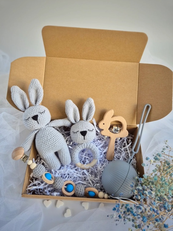 Zabawki (gryzak grzechotka gwiazdka i grzechotka króliczek) są odpowiednie dla dzieci od pierwszego dnia życia (0+).